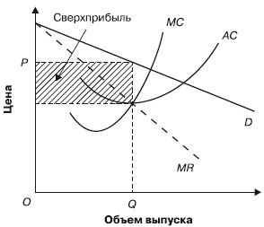 В коротком периоде фирма, максимизирующая прибыль, будет стремиться осуществлять производство при такой комбинации цены (ОР) и объема выпуска (OQ), которая уравнивает предельные издержки (МС) и предельный доход (MR). В этом случае фирма может извлечь сверхприбыль (рис. 56.2).