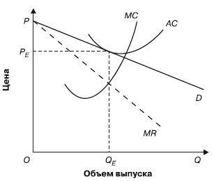 Фирмы по-прежнему максисизируют прибыль при такой комбинации цены (ОР Е ) и объем выпуска (OQ E ), когда предельные издержки равны предельному доходу. Однако в этом случае фирма извлекает лишь нормальную прибыль. Равновесие на уровне нормальной прибыли в долгом периоде аналогично равновесию фирмы при совершенной конкуренции с той разницей, что монополистическая конкуренция вызывает менее эффективную действенность рынка. В условиях монополистической конкуренции фирма выпускает меньше продукта и реализует его по более высокой цене по сравнению с совершенной конкуренцией. Поскольку кривая спроса имеет отрицательный наклон, то она касается долгосрочной кривой средних издержек слева от точки минимума последней. Таким образом, размер каждой фирмы меньше оптимального, вследствие чего на рынке образуется избыточная мощность.