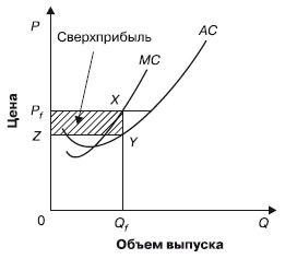 Равновесие конкурентной фирмы в коротком периоде иллюстрируется на рис. 55.1. Показано, что равновесные цена и объем выпуска в коротком периоде равны соответственно P f и Q f . При данной цене конкурентная фирма достигнет объема выпуска на уровне Q f (Р = МС) и получит сверхприбыль (Pf XYZ).