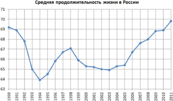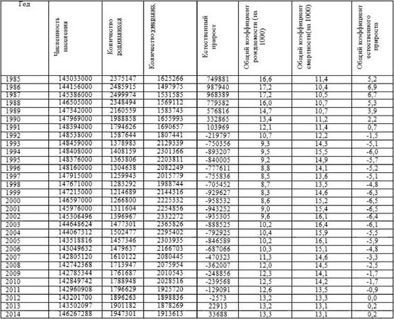 На рисунке наглядно представлено, каким образом экономические псевдореформы отразились на средней продолжительности населения: либерализация цен – резкое снижение продолжительности жизни, дефолт 1998 г. – опять резкое снижение. Линейный коэффициент корреляции между коэффициентом смертности и средней продолжительности жизни составляет минус 0,73, что показывает сильную обратную взаимосвязь. Последствия либерализации цен наглядно отразились на вымирании населения, и именно в этот год зафиксирована первая убыль населения. Максимум убыли было зафиксировано в 2000 г., она составила 958532 человека.