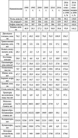 В 2014 г. по отношению к 1990 г. в натуральном измерении увеличилось добыча нефти на 1,7 %, производство дизельного топлива – на 0,9 %, полиэтилена – в 2 раза, шин – на 7,1 %, легковых автомобилей – на 57,8 %. Все иные показатели упали в разы. Так, пошив пальто снизился в 25 раз, производство тракторов – в 14 раз, металлорежущих станков – в 27 раз, экскаваторов – в 12 раз, бульдозеров – в 20 раз.