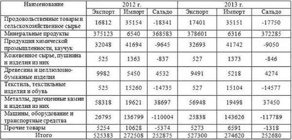 Положительное сальдо зафиксировано у трех групп товаров: минеральные продукты, древесина и целлюлозно-бумажные изделия, металлы, драгоценные камни и изделия из них. Все эти группы объединяет низкая добавленная стоимость. То есть экспортируются сырьевые товары, а приобретаются готовые изделия. Это ярко подчеркивает недостатки неолиберального курса в стране, который лишь увеличивает сырьевую зависимость страны. Необходимо отметить большое отрицательное сальдо по продовольственным товарам, машинам и оборудованию. В 2014 г. Россия столкнулась с экономическими санкциями со стороны США и Европейского Союза. Ограничен, в том числе, и ввоз некоторых технологий. На фоне высокого отрицательного сальдо по машинам и оборудованию стоит сделать вывод о существенных угрозах для экономики страны, так как импортные машины и оборудование используются для обновления устаревших основных фондов. Ответные санкции со стороны России были введены относительно продовольственных товаров. Однако и эта отрасль характеризуется высоким импортом из-за границы, что не отвечает продовольственной безопасности страны.