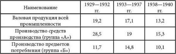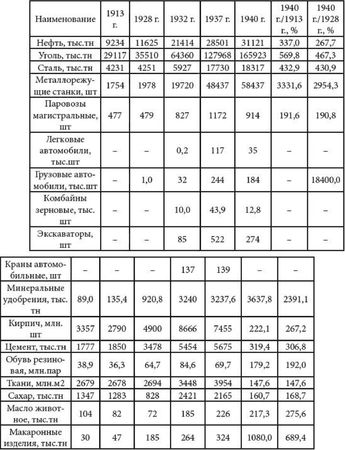 "За период 1929–1937 гг. среднегодовые темпы роста промышленной продукции в СССР составляли около 20 %, в то время как в капиталистических странах они составляли в этот период в среднем всего 0,3 %. Темпы роста промышленности в СССР во много раз превышали темпы роста промышленности главных капиталистических стран в лучшую пору их развития. Так, в США среднегодовой прирост промышленной продукции составлял: за 1890–1895 гг. – 8,2 %, за 1895–1900 гг. – 5,2 %, за 1900–1905 гг. – 2,6 %, за 1905–1910 гг. – 3,6 %". В сравнении доля российского государства в мировом продукте в 1913 г. составляла 4 %, а к 1937 г. достигла 10 %. Динамика производства отдельных видов продукции в натуральном измерении представлена в таблице 1.4.