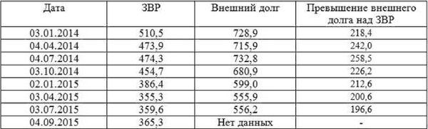 Внешний долг за указанный период снизился на 172,7 млрд. долл., и на 03.07.2015 г. составил 556,2 млрд. долл, что превышает объем ЗВР на 196,6 млрд. долл. Их сравнение не случайно, так как в структуре внешнего долга высока доля государственных компаний, которые частично гасят свои долги за счет ЗВР. Хотя конечно это незаконно: ЗВР создавались для поддержания устойчивости рубля, а не для выплаты внешних долгов государственных компаний.