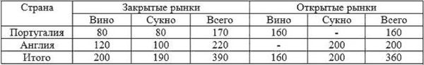 Согласно примеру Португалия имеет абсолютное преимущество в производстве как вина, так и сукна: трудозатраты по обоим товарам меньше. Однако сравнивая относительные издержки производства вина в Португалии (80/90) и Англии (120/110), следует вывод, что относительные издержки производства вина в Португалии меньше, чем в Англии. То есть Португалия имеет сравнительное преимущество в производстве вина, а Англия – в производстве сукна. И если Португалия будет полностью специализироваться на производстве вина, а Англия – на производстве сукна, то общие трудозатраты составят 360 чел/час, что меньше, чем без кооперации. Таким образом, две страны получат большую экономию от открытия рынков.