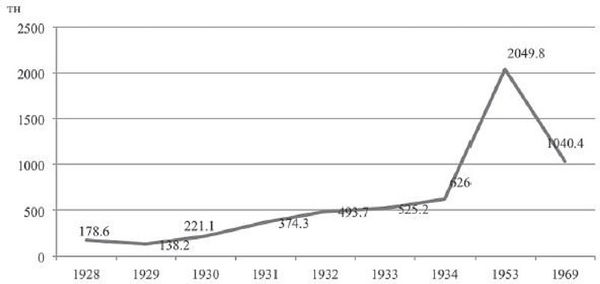 На графике наглядно представлен рост запасов золота в период индустриализации. Максимума он достиг в 1953 г. И это несмотря на войну и послевоенное время!