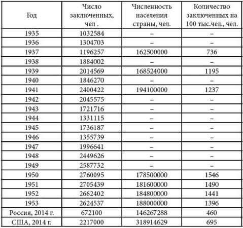 Максимальное количество заключенных было зафиксировано в 1950 г., оно составило 2760095 чел. На этот же год приходится максимум заключенных на 100 тысяч населения – 1546 чел. Сейчас число заключенных в России и США соответственно составляют 460 и 695 человек на 100 тысяч населения. Это конечно меньше уровня СССР в 1950 г., однако, в США число заключенных в относительном измерении приближается к величине 1937 г. И пока не замечено упреков в экономическом господстве США за счет эксплуатации заключенных. Кроме того, система ГУЛАГ не занималась производством высокотехнологичной продукции, а работники из числа заключенных привлекались лишь к малоквалифицированному труду.