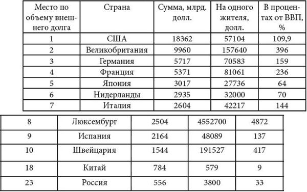 Лидерство, естественно, принадлежит США. Но с учетом численности населения и ВВП американский долг блекнет перед другими странами. В Великобритании его величина на душу населения в три раза больше, чем в США, а если считать через соотношение ВВП – в 3,7 раза. Люксембург по относительным показателям явный "лидер". На одного человека там приходится 4,6 млн. долл. долгов, а в соотношении с ВВП – 36000 %. Сумма огромная, но стоит учитывать, что Люксембург – это всемирная отмывочная контора, поэтому так высок внешний долг.
