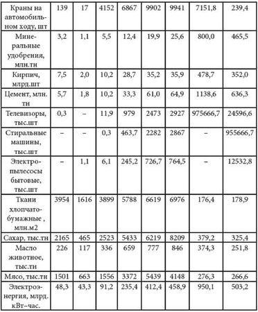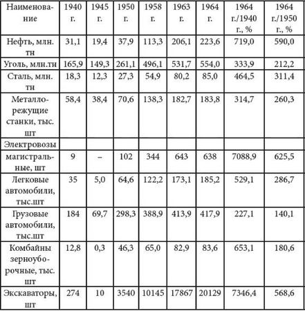В 1964 г. по отношению к 1950 г. объем производства стали увеличился в 3,1 раза, металлорежущих станков – в 2,6 раза, легковых автомобилей – в 2,9 раза, экскаваторов – в 5,7 раза. Активно стали осваивать производство новых товаров: телевизоров, стиральных машин и бытовых электропылесосов. Общее производство электроэнергии увеличилось более чем в пять раз.