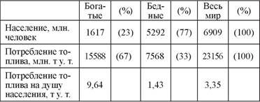Такое деление 50 на 50 примечательно. Но разница между "бедными" и "богатыми" еще более интересна. Из общего прироста мирового потребления топлива с 5,5 млрд. до 23,2 млрд. т.у.т., то есть прироста в 17,7 млрд. т, на долю "богатых" придется почти две трети, а на долю "бедных" - лишь чуть более трети. За весь 34-летний период мир израсходует 423 млрд. т.у.т., из них "богатые" потребят 321 млрд. т., или 75 процентов, а "бедные" - 104 млрд. т.