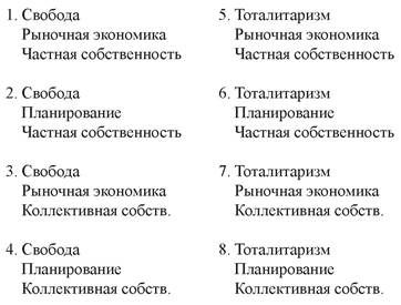 Общество, озабоченное экономическими проблемами, стоит перед тремя важнейшими выборами - выбором между частной собственностью на средства производства и всякого рода государственной или коллективной собственностью; выбором между рыночной экономикой и различными вариантами "планирования" и выбором между "свободой" и "тоталитаризмом". Понятно, что в реальности ни одной из противоположностей не встретишь в чистом виде, ибо внутри этих трех пар противоположности дополняют друг друга, но одна из них непременно будет доминировать.