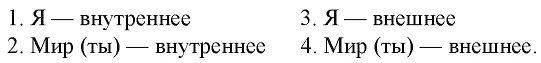 Из этих двух пар - "Я" и "Мир" и "Внешняя Видимость" и "Внутренний Опыт" - получается четыре "сочетания", которые можно обозначить таким образом: