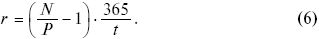 Обе причины, названные выше, занижают истинную доходность векселя. Следовательно, требуется перерасчет ставки дисконта в показатели доходности финансовых инструментов на базе 365 дней и учет цены векселя. Таким образом, эквивалентная ставка доходности векселя может быть найдена из уравнения 4: