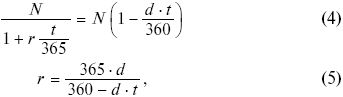 При учете векселя коммерческие банки указывают ставку дисконта в процентах годовых к номиналу векселя. Рублевый эквивалент ставки дисконта можно получить, используя следующую формулу [Буренин, 2002, с. 121–123]: