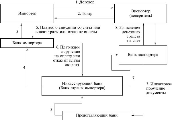 Инкассовая форма расчетов выгодна импортеру, поскольку она подразумевает оплату действительно поставленного товара, а расходы по проведению инкассовой операции относительно невелики. Расчеты в форме инкассо позволяют банкам осуществлять контроль за своевременностью получения платежа, однако банки, как правило, не имеют реальных рычагов воздействия на импортера с целью ускорения оплаты (акцепта) документов. Инкассовая форма расчетов в определенной степени выгодна и экспортеру, так как банки защищают его право на товар до момента оплаты документов или акцепта тратт (если, конечно, экспортер не дал инструкций о выдаче документов без оплаты). Право на товар импортеру дают товарораспорядительные документы, во владение которыми он вступает после их оплаты (акцепта тратт), если экспортер не дал банкам инструкций о выдаче документов без оплаты.