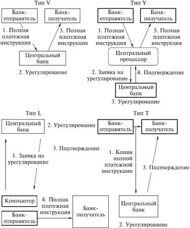 В ряде стран, особенно там, где для передачи информации используется коммуникационная система SWIFT, применяется Y-образная схема маршрута. Банк-отправитель посылает платежное поручение в центральный процессор сети SWIFT. Там создается сокращенный файл платежного документа, содержащий лишь те сведения, которые необходимы для урегулирования расчетов. Этот файл отсылается в центральный банк, который после проверки состояния счета на основе этого документа производит платеж. Подтверждение о произведенном платеже центральный банк направляет в центральный процессор сети, откуда оригинальное платежное поручение направляется банку-получателю. Тип Y в настоящее время используется в системах RTGS Бельгии, Германии, Швеции, Швейцарии, Великобритании.