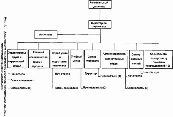 Как и другие службы, отдел человеческих ресурсов имеет собственную иерархию должностей, являющуюся составной частью общеорганизационной структуры. Во главе отделов, секторов или групп стоят руководители среднего звена - директора или начальники отделов, подчиняющиеся вице-президенту по человеческим ресурсам. Главной их задачей является организация работы вверенной им системы управления персоналом, а также предоставление экспертных советов своему руководителю. Необходимо повторить, что выполняемые различными подразделениями службы человеческих ресурсов функции и их значение для организации могут существенно отличаться, а вместе с этим может различаться и положение руководителей отделов в организационной иерархии. Так, например, вклад директора по компенсации в достижение стоящих перед компанией целей может быть значительно более весомым, чем вклад начальника сектора администрации, несмотря на то, что обе эти позиции подчиняются непосредственно вице-президенту по персоналу.