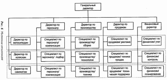 МАТРИЧНАЯ организационная структура, которая призвана преодолеть характерные для традиционных организационных форм недостатки, представляет собой их "гибрид" (см. рис. 6). Матричная организация объединяет работу функциональных специалистов с существованием продуктовых подразделений - эксперты из функциональных отделов закрепляются за одним или несколькими продуктовыми подразделениями и оказывают поддержку их сотрудникам.