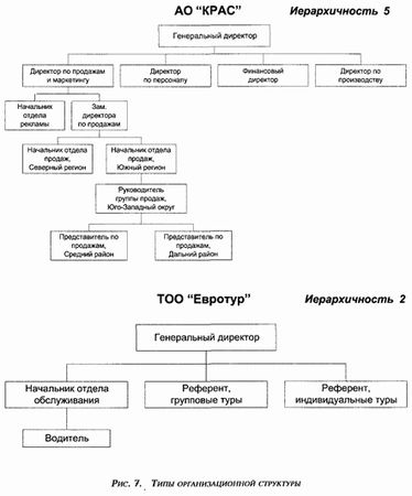 Еще одной важной характеристикой организационной структуры является иерархичность или величина расстояния между высшим и низшим звеном организации. Чем больше расстояние (число уровней) между руководителем и рядовым исполнителем, тем выше степень иерархичности в организации (см. рис. 7).