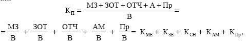 где МЗ – материальные затраты; ЗОТ – затраты на оплату труда; ОТЧ – отчисления по единому социальному налогу; АМ – амортизационные отчисления; Пр – прочие затраты; В – выручка (нетто) от продаж; КП – коэффициент полных затрат; КМЕ – коэффициент материалоемкости; КЗЕ – коэффициент зарплатоемкости; КСН – коэффициент отчислений по единому социальному налогу; КАМ – коэффициент удельной амортизации; КПр – коэффициент удельных прочих затрат.