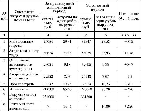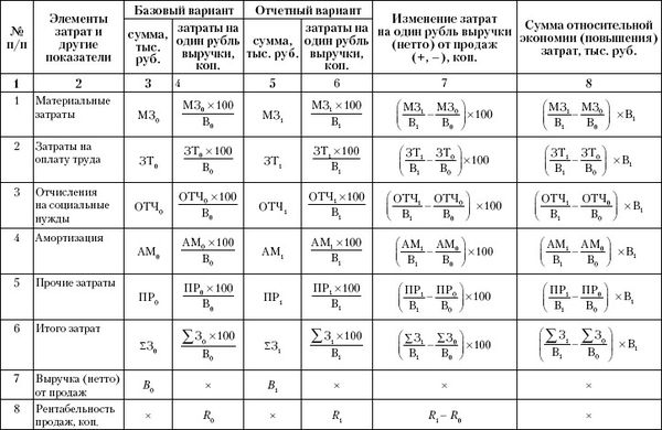 В графах 3 и 5: МЗ0, МЗ1; ЗТ0, ЗТ1; ОТЧ0, ОТЧ1; АМ0, АМ1; ПР0, ПР1 – суммы затрат в денежных единицах по экономическим элементам соответственно в базовом и отчетном вариантах; Σ З0, ΣЗ1 – итоговая сумма затрат по пяти элементам в базовом и отчетном вариантах; В0, В1 – выручка (нетто) от продаж в базовом и отчетном вариантах в денежных единицах.