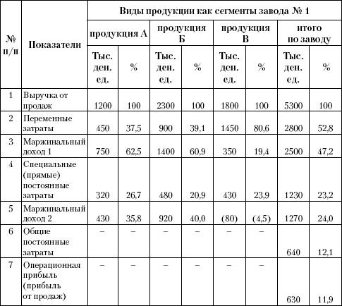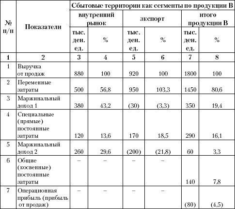 Данные таблицы говорят о том, что более 50 % продаж (920 тыс. ден. ед. от 1800 ден. ед.) изделия В приходится на экспорт, т. е. делается попытка завоевать (или удержать уже завоеванную) определенную экспортную нишу. Однако экспортная политика осуществляется неэффективно, поскольку продажи на экспорт приносят маржинальный и сегментированный убытки в 30 тыс. ден. ед. и 200 ден. ед. соответственно (коэффициенты валового и сегментированного убытка равны 3,3 % и 21,8 %). Одновременно с этим продажи на внутреннем рынке обеспечивают значительный маржинальный доход 1 в сумме 380 тыс. ден. ед. (коэффициент маржинального дохода достаточно высок и составляет 43,2 %), а также сегментированную прибыль в сумме 260 тыс. ден. ед. (коэффициент сегментированной прибыли равен почти 30 %).