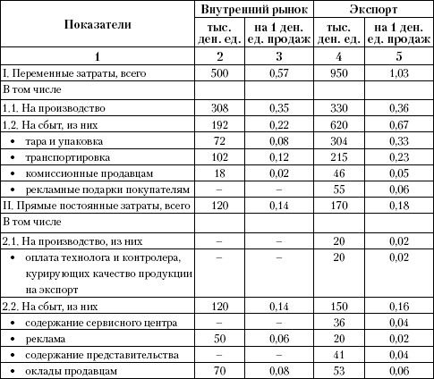 Анализ табл. 8.5 позволяет сделать вывод, что принципиально более высокий уровень затрат, приходящихся на одну денежную единицу экспортных продаж, по сравнению с продажами на внутреннем рынке вызван почти исключительно значительными дополнительными затратами на сбыт продукции. При этом, что характерно, доля переменных затрат (т. е. затрат на материалы и оплату труда основных производственных рабочих) на производство продукции, идущей на экспорт, и продукции внутреннего потребления практически одинакова (0,36 ден. ед. и 0,35 ден. ед. на одну денежную единицу продаж). Иначе говоря, никаких различий в технологическом процессе изготовления продукции В применительно к определенному рыночному сегменту нет.