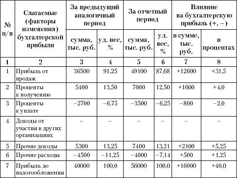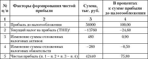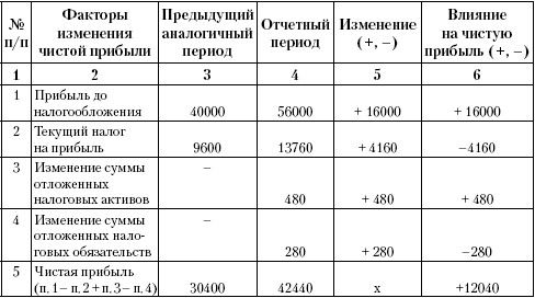 В нашем примере сумма бухгалтерской прибыли в отчетном периоде увеличилась по сравнению с предыдущим периодом на 16 000 тыс. руб., а сумма чистой прибыли – только на 12 040 тыс. руб. Повлиял в основном один фактор, а именно увеличение суммы текущего налога на прибыль, которое снизило рост чистой прибыли на 4160 тыс. руб. Влияние двух других факторов незначительно.