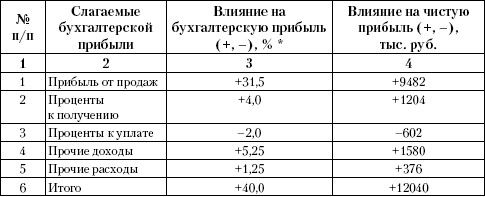 Поскольку чистая прибыль является частью бухгалтерской прибыли, то можно рассчитать влияние на чистую прибыль факторов, обусловивших изменение бухгалтерской прибыли, методом пропорции (табл. 9.4).