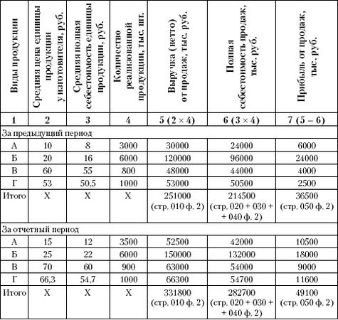 Условные обозначения: q1 – количество конкретных видов продукции, реализованных в отчетном периоде в натуральном выражении; p0, p1 – цены реализации конкретных видов продукции в предыдущем и отчетном периодах; s0, s1 – полная себестоимость единицы конкретного вида продукции в предыдущем и отчетном периодах; П0, П1 – прибыль от продаж в предыдущем и отчетном периодах.