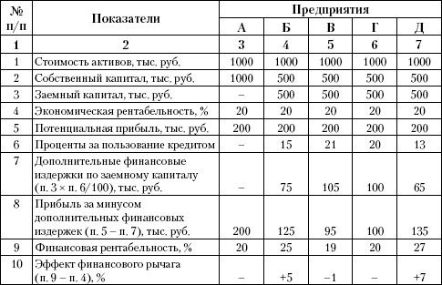 Сопоставив уровень экономической рентабельности предприятия Б (20 %) и уровень его финансовой рентабельности (25 %), определим эффект финансового рычага, равный 5 %.
