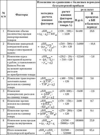 Таблица 12.7. Методика и расчет влияния факторов на изменение в отчетном периоде по сравнению с базисным периодом бухгалтерской прибыли от продажи импортируемых товаров