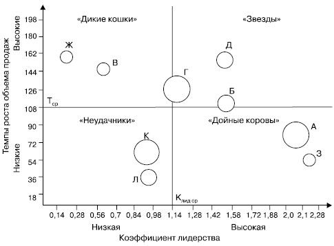 В рамках матрицы выделяют четыре позиции продукции: так называемые "звезды", "дойные коровы", "дикие кошки" ("трудные дети") и "неудачник" ("собака"). Для каждого типа предлагаются соответствующие товарные стратегии.