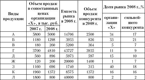 Таблица 5.1. Характеристика рыночной ситуации по конкретным видам продукции, выпускаемой организацией "Х"