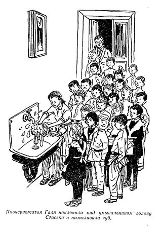 Пионервожатая Галя наклонила над умывальником голову Стаськи и намыливала чуб. Руки у Гали были зелёными. Она тёрла голову Стаськи, поливала из крана водой. Стаська негромко стонал, жаловался, что вода холодная и течёт за воротник.