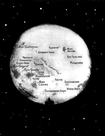 - Там обнаружили несколько "морей" - больших тёмных пятен (их легко заметить на снимке), длинный горный хребет и несколько кратеров, таких же, как на видимой стороне Луны. Советские учёные дали им всем имена: горный хребет Советский, Море Москвы, кратер Жолио-Кюри… Самый большой кратер назвали "Циолковский" в честь Константина Эдуардовича Циолковского - знаменитого русского учёного, который первым доказал, что в космическое пространство можно проникнуть только с помощью ракет. Он мечтал о полётах в космос человека, о полётах, которые осуществились в наши дни.