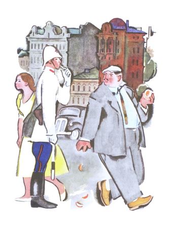 - Ах так, - говорит Иван Фёдорович, - ну, так знайте, что вы и ваш сын очень несознательные люди. Вам известно, что ваш сын Геня ни больше ни меньше как катается на трамвайной колбасе? Я его два раза уже снимал с трамвайной колбасы. Мне стыдно думать, что бывают такие несознательные отцы и дети. Вы уже пожилой гражданин - и вдруг швыряете корки на тротуар. А если кто-нибудь поскользнётся на вашей корке и сломает себе ногу?