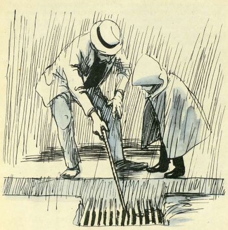 Они вдвоём пошли по склону вверх, выгребая по пути листья из канавы, чтобы вода свободно лилась в решётку. Так дошли они до самой вершины. И вот, когда они кончили работу, вода хлынула прямо в решётку, как ей и полагалось.