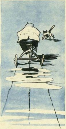 И он покатил на своём велосипеде через все лужи, какие попадались ему на пути. Если это были маленькие лужицы, за велосипедом оставался только один след. Если средние, получались два рельса. А если попадалась большая лужа, в которой отражалось чуть ли не всё небо, велосипед проезжал через неё всеми своими колёсами, и сзади вытягивались три рельса.