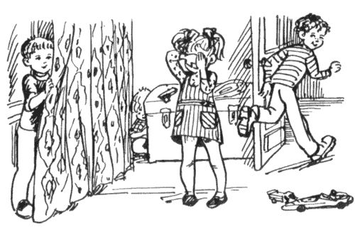 И мы стали играть в прятки. Это было прекрасно, потому что мы с Мишкой все время подстраивали так, чтобы водить выпадало маленьким: Костику или Аленке, - а сами все время прятались и вообще водили малышей за нос. Но все наши игры проходили только в Мишкиной комнате, и это довольно скоро нам стало надоедать, потому что комната была маленькая, тесная и мы все время прятались за портьеру, или за шкаф, или за сундук, и в конце концов мы стали потихоньку выплескиваться из Мишкиной комнаты и заполнили своей игрой большущий длинный коридор квартиры.