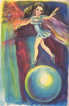 И вдруг на арену выбежала маленькая девочка. Я таких маленьких и красивых никогда не видел. У нее были синие-синие глаза, и вокруг них были длинные ресницы. Она была в серебряном платье с воздушным плащом, и у нее были длинные руки; она ими взмахнула, как птица, и вскочила на этот огромный голубой шар, который для нее выкатили. Она стояла на шаре. И потом вдруг побежала, как будто захотела спрыгнуть с него, но шар завертелся под ее ногами, и она на нем вот так, как будто бежала, а на самом деле ехала вокруг арены. Я таких девочек никогда не видел. Все они были обыкновенные, а эта какая-то особенная. Она бегала по шару своими маленькими ножками, как по ровному полу, и голубой шар вез ее на себе: она могла ехать на нем и прямо, и назад, и налево, и куда хочешь! Она весело смеялась, когда так бегала, как будто плыла, и я подумал, что она, наверно, и есть Дюймовочка, такая она была маленькая, милая и необыкновенная. В это время она остановилась, и кто-то ей подал разные колокольчатые браслеты, и она надела их себе на туфельки и на руки и снова стала медленно кружиться на шаре, как будто танцевать. И оркестр заиграл тихую музыку, и было слышно, как тонко звенят золотые колокольчики на девочкиных длинных руках. И это все было как в сказке. И тут еще потушили свет, и оказалось, что девочка вдобавок умеет светиться в темноте, и она медленно плыла по кругу, и светилась, и звенела, и это было удивительно, - я за всю свою жизнь не видел ничего такого подобного.