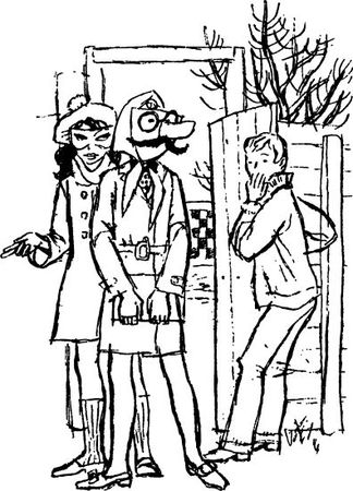 Но девочки просовывать руку в круглое отверстие калитки не спешили. Алька повернул железную ручку и… чуть не попятился. Желтенький плащ был Галкин, а вместо Галки на Альку строго взирал красноносый дядька с рыжими усами, в больших круглых очках. А черные Динкины глаза смотрели сквозь узкие длинные прорези маски неземной красавицы.