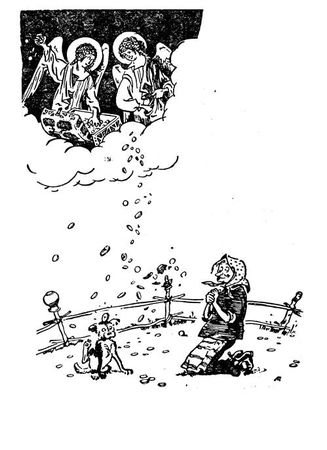 Обрадовалась бабка, собрала деньги в мешок, к соседям кинулась, серебро показывает. Соседи ахают, удивляются, а она им одно твердит: "Вот мне и подал бог. Вам, безбожникам, назло вместе с дождем с неба прислал!" Такую пропаганду божественную развела, что дальше некуда.