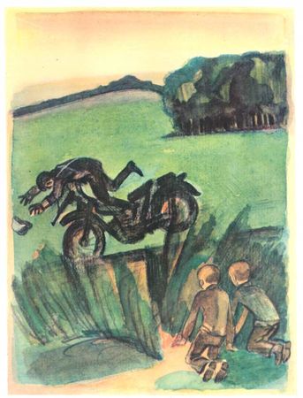 Толстая кожаная куртка и такой же шлем защитили мотоциклиста. Он вскочил и, прихрамывая, побежал к завалившейся набок машине. В передней шине торчал толстый гнутый гвоздь. Мотоциклист сунул гвоздь в карман, погрозил кому-то кулаком и, толкая в руль тяжёлую машину, потащился к деревне.