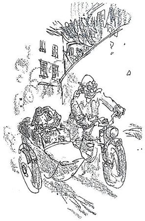 Но не думайте только, что бабушка Мариучча в своем черном платье в белый горошек, в перчатках и с большой сумкой с серебряной пряжкой усаживалась на мотоцикл верхом, обхватив за пояс галантного провожатого. Нет. К мотоциклу синьора Владимиро (так звали соседа) была прицеплена сбоку специальная коляска - это, если кто не знает, что-то вроде железной лодочки на колесах с пассажирским сиденьем внутри.