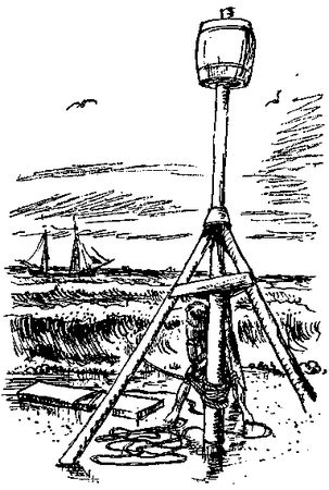 Наконец я выкарабкался. Глянул на судно: стоит и парусами на зыби колышет, как птица подстреленная. А я так рад был, что на земле, и мне все казалось, что еще качает, что земля подо мной ходит. Я отвязался от доски и стал тянуть веревку. Знак как раз тут же был: громадный столб с укосинами, и наверху что-то наворочено вроде бочки. Я взял веревку на плечи и пошел. Ноги в песке вязнут, и во рту песок, и в глаза набило, и низом метет песком. Еле веревку вытащил… Смотрю, уж кончилась тонкая веревка, и канат пошел толстый. Я его запутал, как умел, за знак, под самый корень, и лег на песок - весь дух из меня вон, пока я тянул.