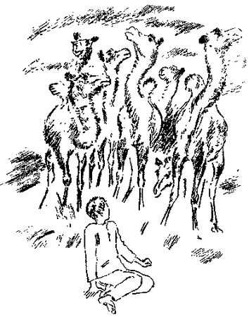 А вдали я увидел, будто стадо. Пошел туда - ну, вот, люди, пастухи там должны быть. Боялся только, что собаки выскочат. Я перестал бежать, но шел со всех сил. Волочу ноги по песку. Когда стал подходить, вижу - это верблюды. Я совсем близко подошел - ни одной собаки нет. И людей тоже.