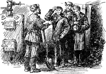 Вдруг Толя зажмурился. Перед ним распахнулась дверь, и в угольную яму брызнул ослепительный электрический свет. На пороге, в зимней шапке-ушанке, в валенках с калошами из красной резины, стоял старик с лопатой в руках. Толя сразу его узнал. Это был Савелий Яковлевич. Не заметив ребят, сидевших в углу, он поддел лопатой уголь и понес его к топке.
