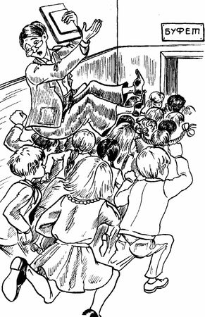 Прозвенел звонок. Несколько человек из прибывших в первую очередь были пропущены Плюшей в буфет, как обладающие соответствующим социальным статусом. Остальные в ответ на отказ быть пропущенными толпились около двери. Вскоре толпа выросла до невероятных размеров, человек 50–60 (!), задние ряды давили на передние, а те, в свою очередь, упирались в Плюшу, которая торчала в двери, как затычка.