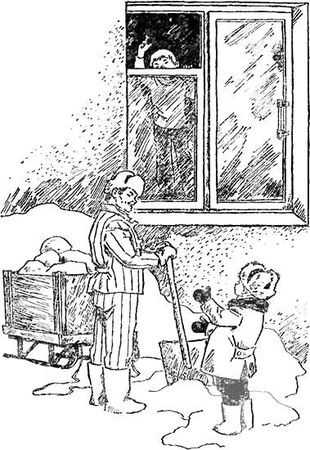 Вскоре во двор вышел и Петя. Шапка у него была нахлобучена на лоб. Он тащил за собой лёгкие деревянные санки.